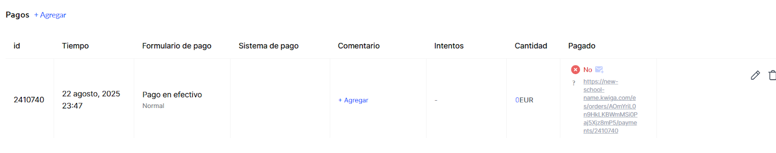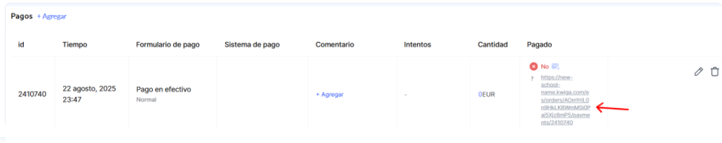 Después de guardar, el pago se añadirá al pedido y aparecerá un enlace de pago activo en la página. Puede copiarse y enviarse al estudiante por cualquier método conveniente.