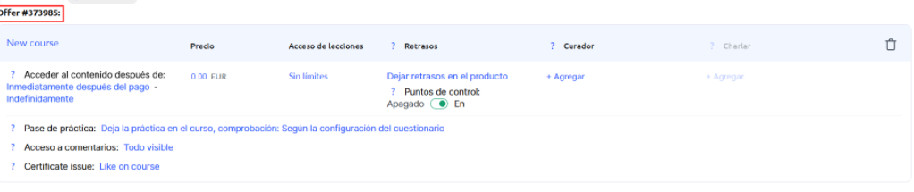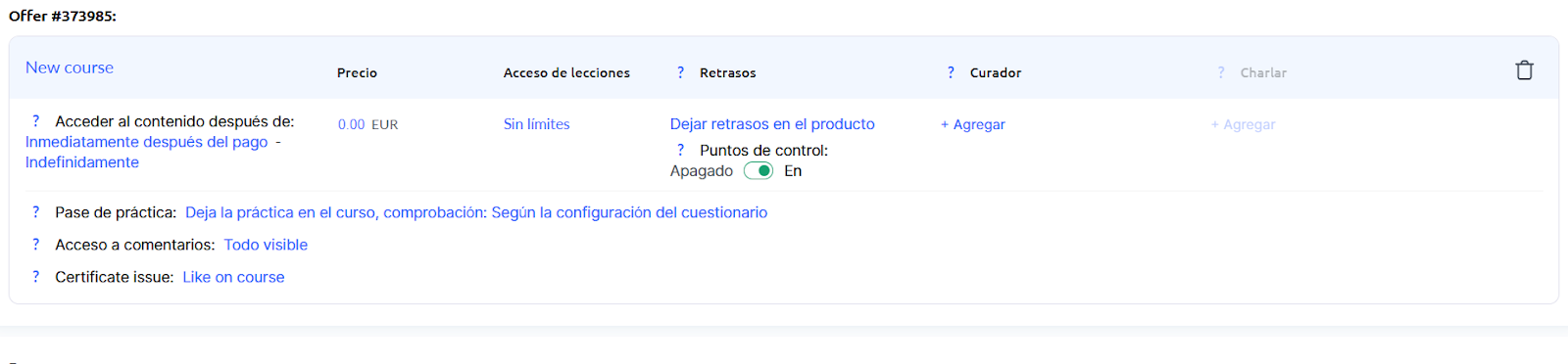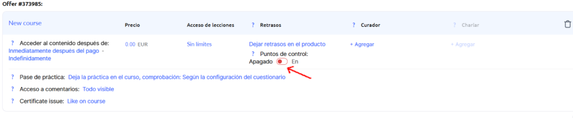 Una vez abierto el pedido, puedes modificar cualquier producto añadido: extender la duración del acceso, cambiar la fecha de inicio, establecer o eliminar retrasos en la liberación de contenido, desactivar los puntos de control o quitar el requisito de completar tareas prácticas.