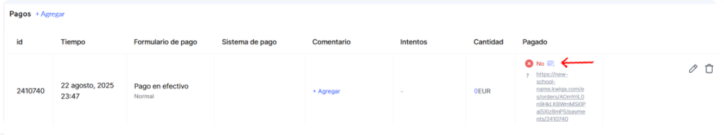 Estado del pago — el interruptor debe permanecer en rojo junto a No pagado si el pago aún no se ha recibido. La plataforma generará un enlace de pago si todavía no se ha realizado.