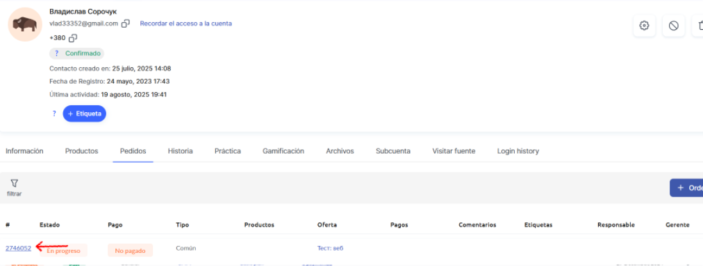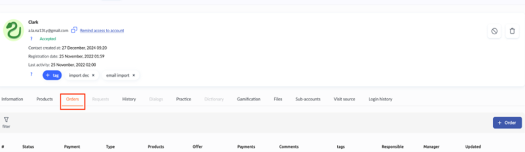 Un pedido contiene todas las condiciones de acceso a un curso o producto: qué se compró, a qué precio, la duración y otra información relacionada. En la mayoría de los casos, el pedido se crea automáticamente — cuando el cliente visita la página de la oferta o compra a través de un formulario. Estos pedidos indican desde qué oferta fueron creados.