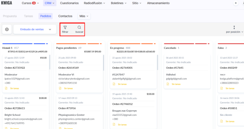 Luego localiza el pedido deseado en el embudo — por ejemplo, utilizando la búsqueda o los filtros.