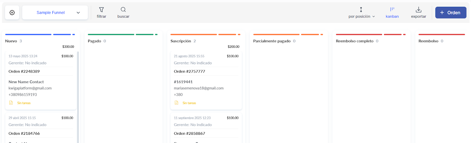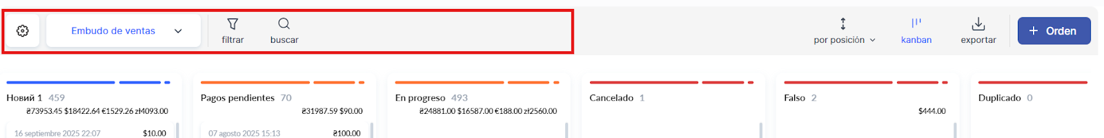 Aquí, los pedidos se ordenan por estado dentro del embudo correspondiente, el cual se presenta visualmente como un tablero Kanban o una tabla.