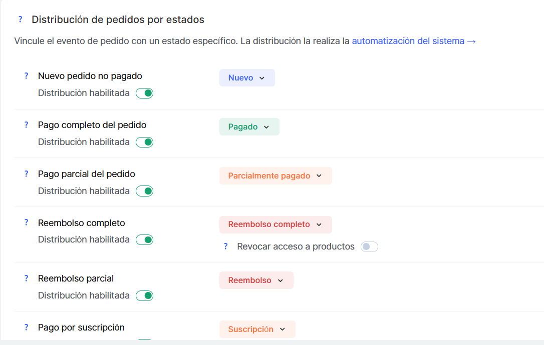Cada embudo de ventas te permite configurar la distribución automática de los pedidos según su estado.