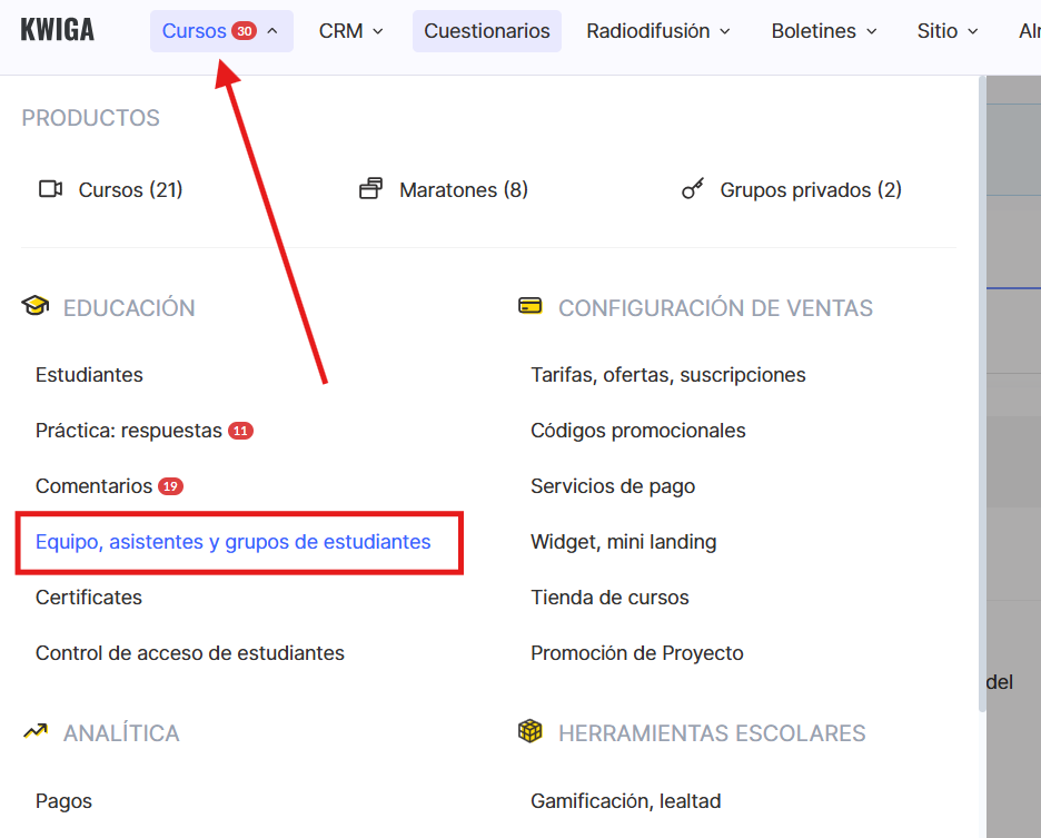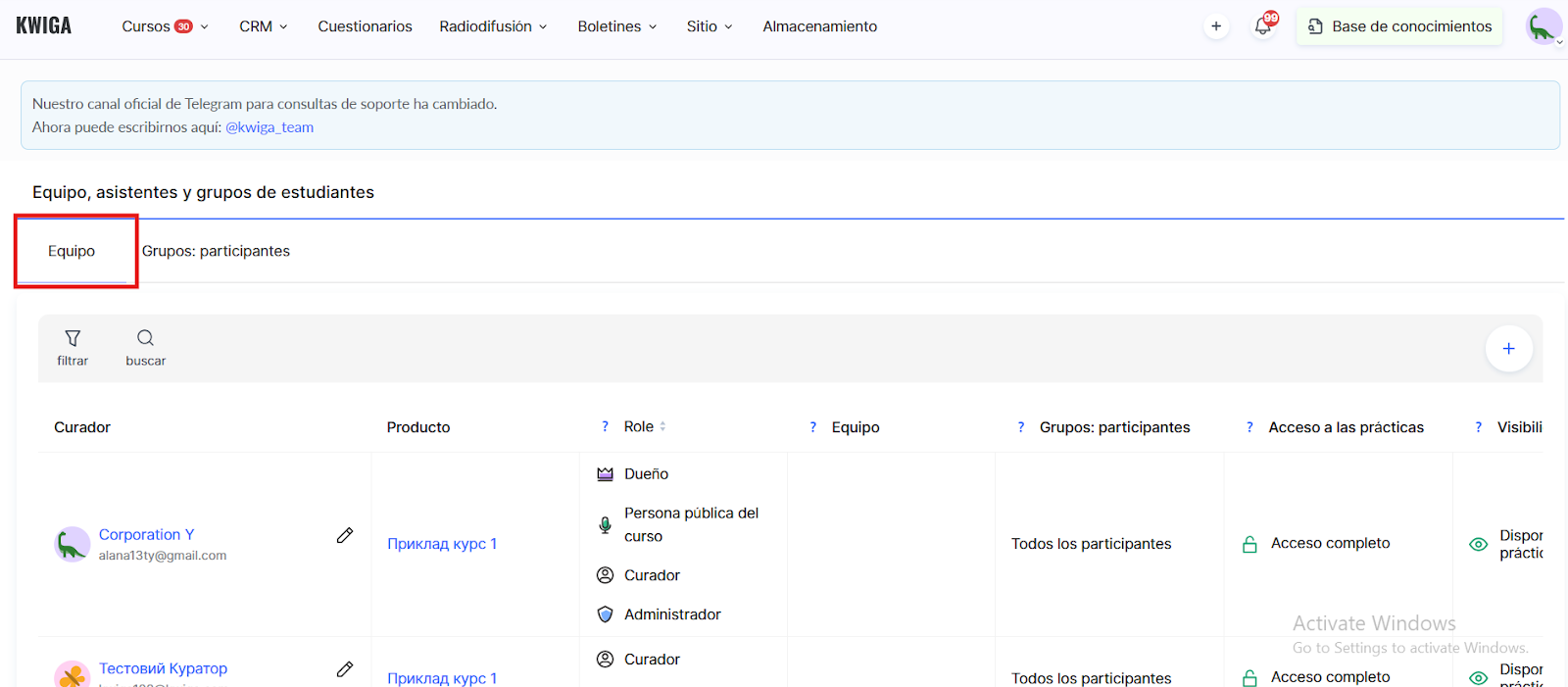 La organización adecuada del equipo del proyecto y la gestión de los grupos de participantes simplifica significativamente el proceso educativo y ayuda a establecer una comunicación efectiva. En Kwiga, existe una sección dedicada donde puedes gestionar a los asistentes, sus roles, equipos y el acceso de los estudiantes.