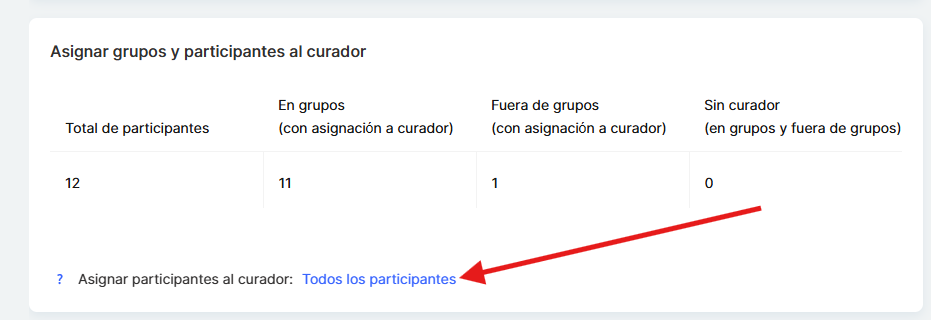 ● Todos los participantes: el asistente tiene acceso a todos los participantes del curso. Esto es adecuado para cursos en los que el asistente necesita ver todo el flujo de estudiantes, independientemente de su distribución.