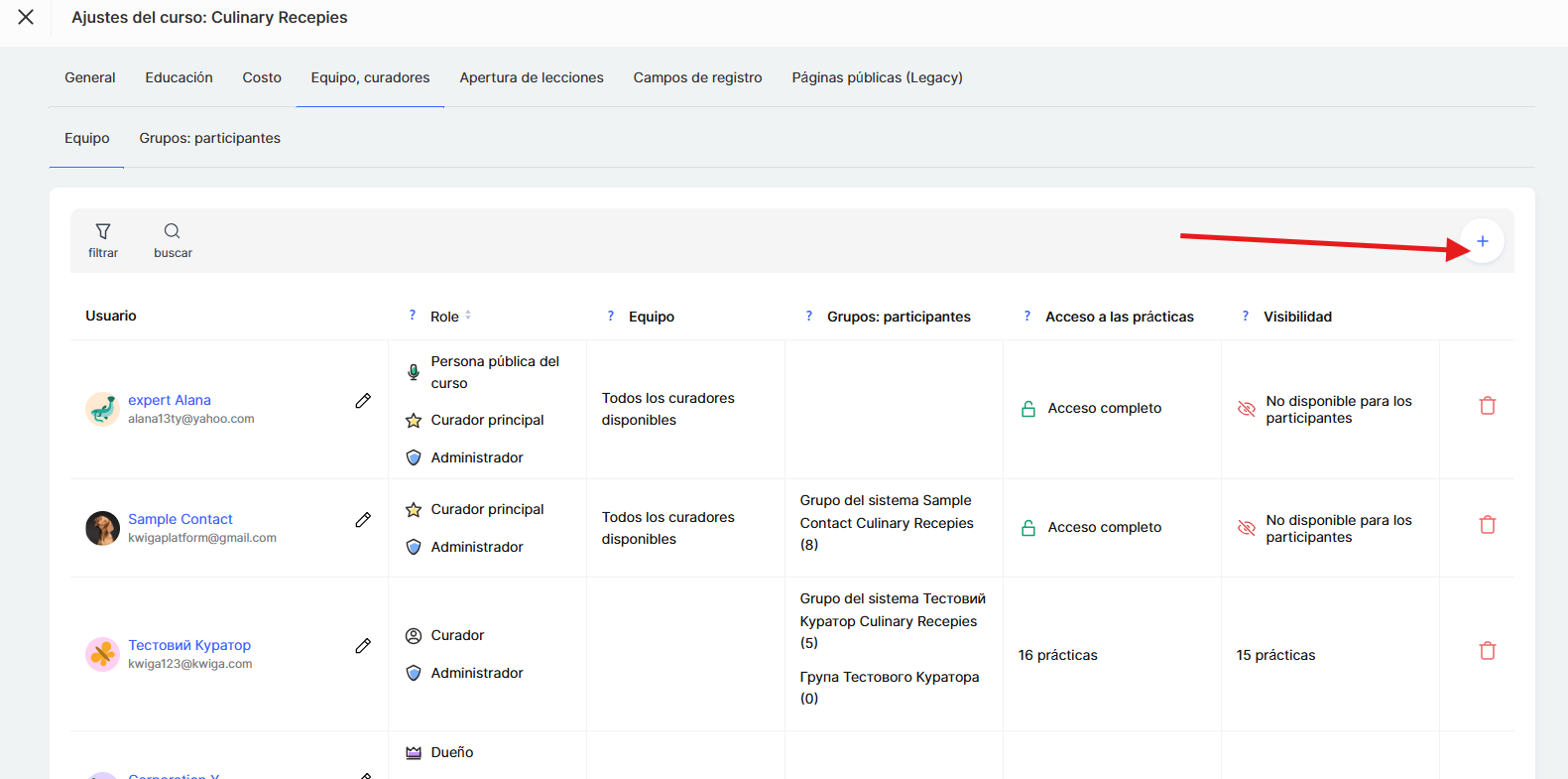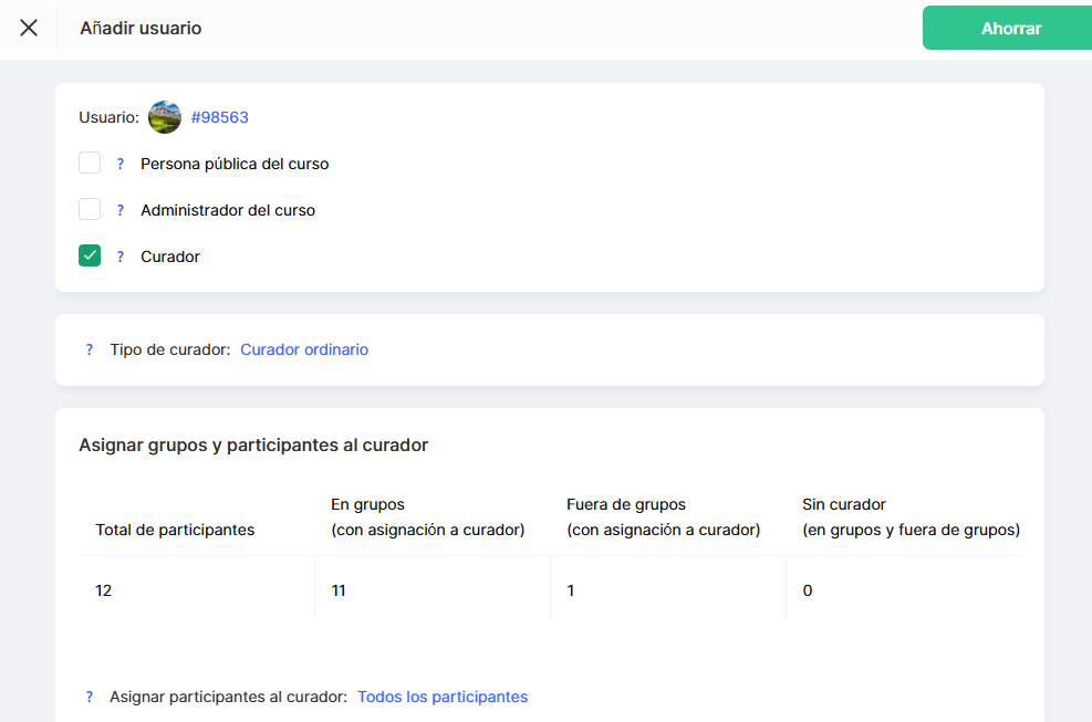● Grupos específicos: el asistente ve solo a los participantes que se le han asignado. Esta es la mejor opción si un curso tiene varios grupos o itinerarios paralelos y cada asistente es responsable únicamente de su parte de estudiantes. Por ejemplo, si un curso tiene grupos para principiantes y para participantes avanzados, el asistente trabajará solo con la categoría que se le haya asignado.