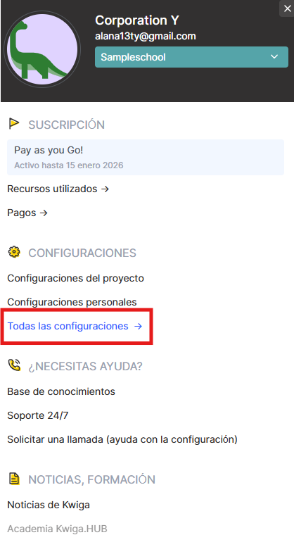 Si necesitas eliminar al usuario por completo de la plataforma, comienza abriendo la configuración. Para hacerlo, haz clic en el avatar del perfil en la esquina superior derecha y ve a la sección Todas las configuraciones.
