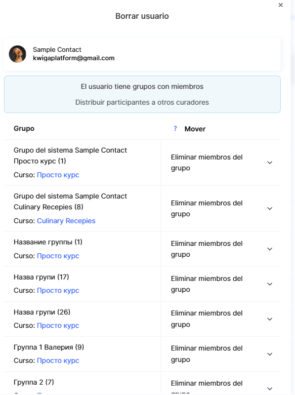 Si el usuario tiene grupos con participantes, primero deben ser reasignados a otros asistentes. Para cada grupo puedes seleccionar una de las siguientes opciones: