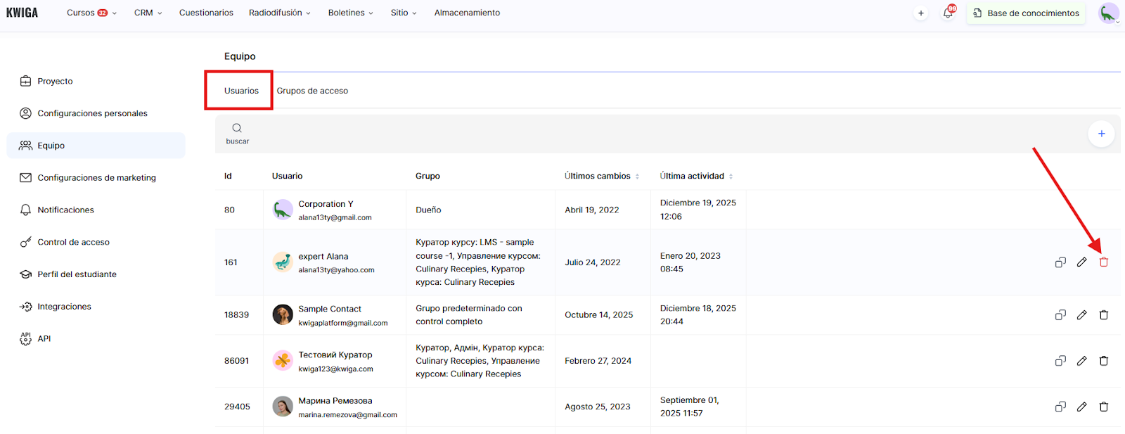 Importante: Si solo necesitas eliminar al usuario de un curso específico y no de todo el proyecto, sigue las instrucciones correspondientes para ese caso.