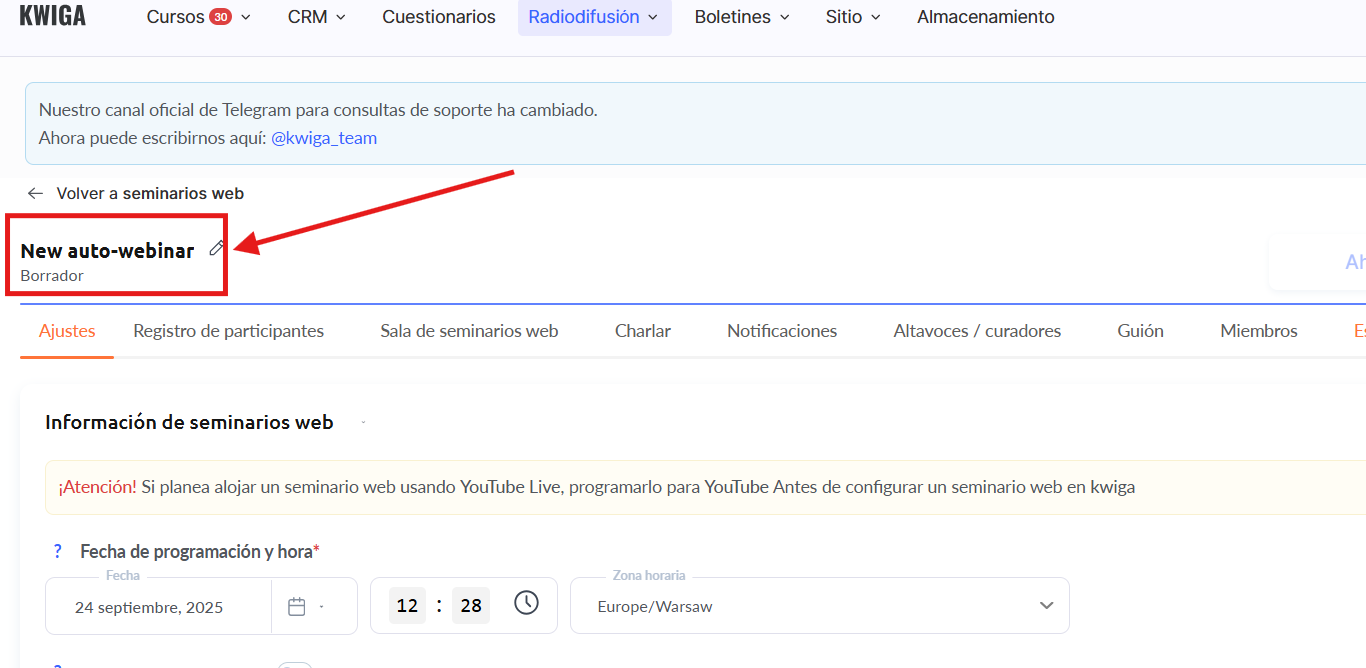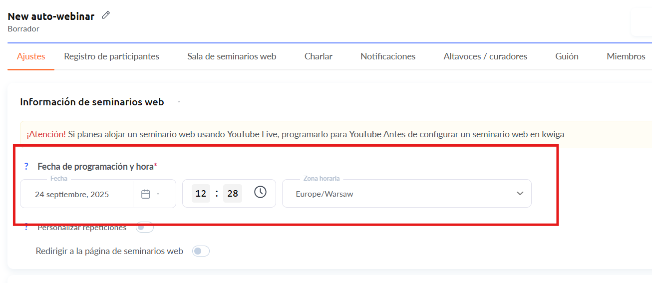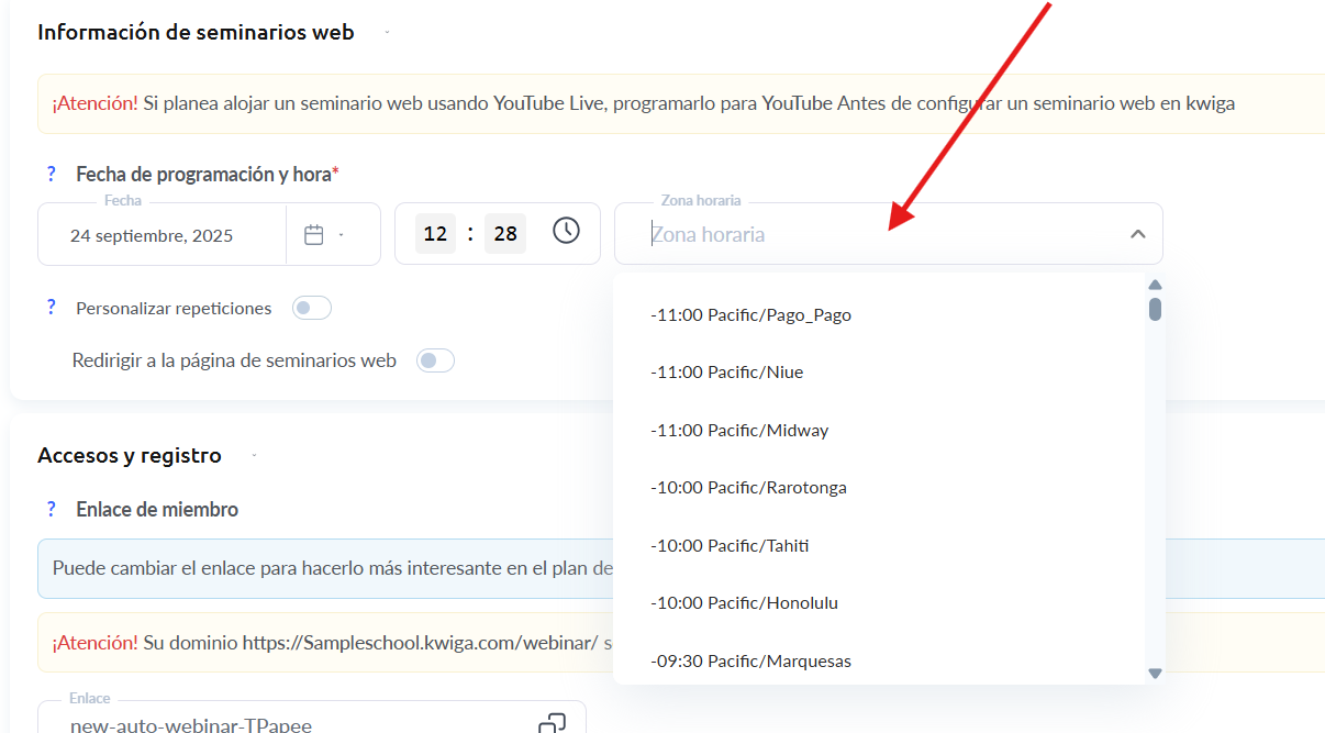 Si planeas realizar el webinar para asistentes en una zona horaria diferente (por ejemplo, en otro país), presta especial atención a este punto.