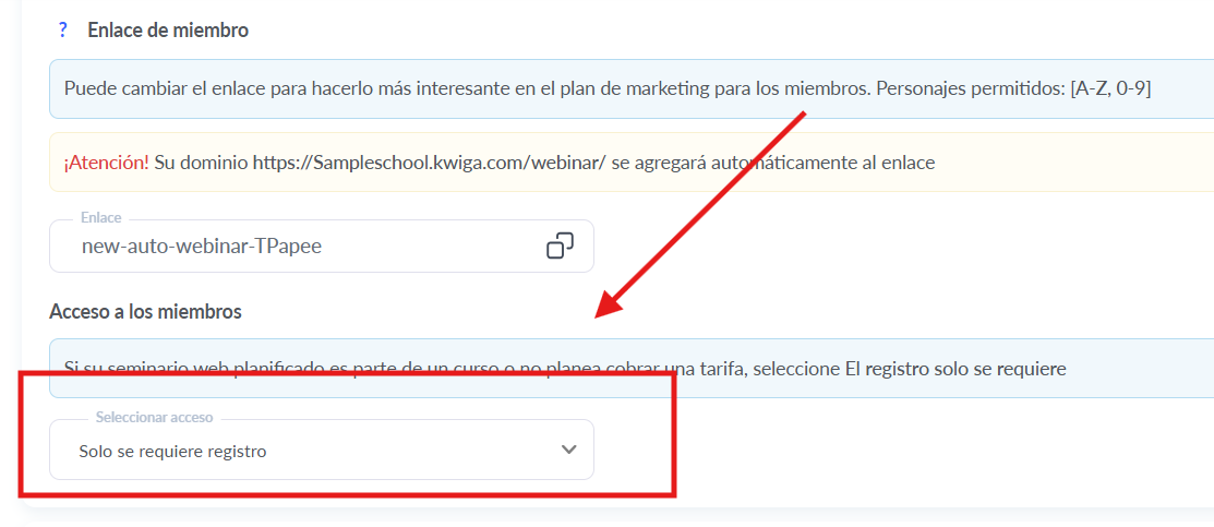 Para organizar un webinar automatizado gratuito, ve a la sección Acceso y Registro y selecciona la opción Solo se requiere registro.