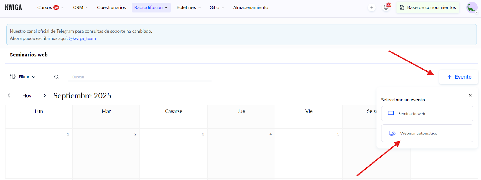 En la parte superior de la plataforma Kwiga, ve a la pestaña Webinars y haz clic en Start New. En la página que se abre, haz clic en +Event y selecciona Automated Webinar de la lista.
