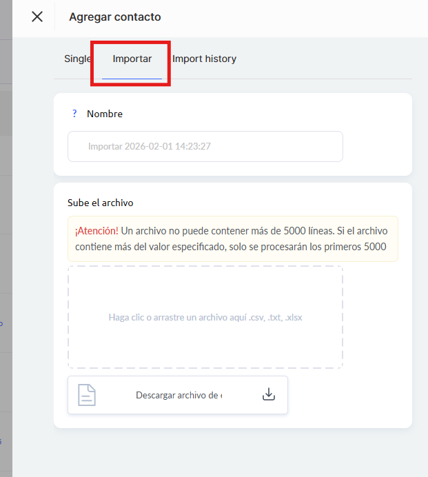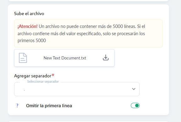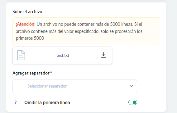 Si el archivo contiene más de 5.000 filas, el sistema procesará únicamente las primeras 5.000 entradas. Hay un archivo de ejemplo disponible para descargar y así asegurar el formato correcto.