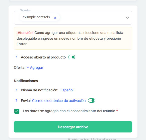En este paso, puedes añadir etiquetas a todos los contactos del archivo, otorgar acceso a un producto y seleccionar la oferta correspondiente.