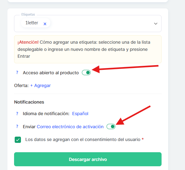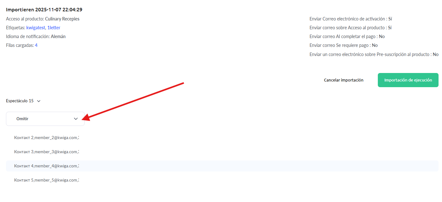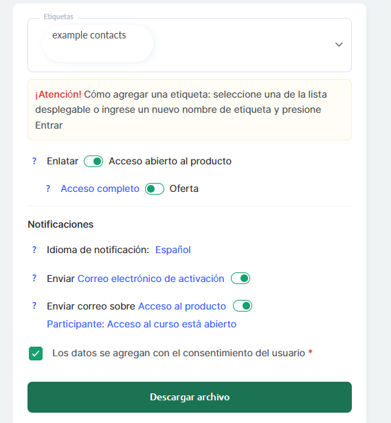 En esta etapa, también puedes añadir etiquetas a todos los contactos del archivo y elegir si deseas otorgar acceso a un producto o desactivar las notificaciones de activación por correo electrónico.