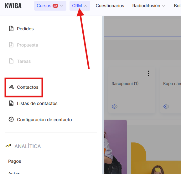 En la plataforma Kwiga, gestionar contactos y estudiantes es fácil. Puedes elegir entre dos opciones para la transferencia masiva de contactos: importar directamente a un curso o transferir la base de datos al CRM.
