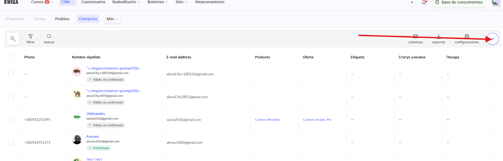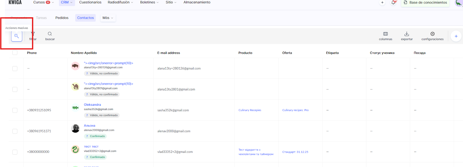 Nota: El CRM de Kwiga también permite realizar acciones masivas sobre todos los contactos o sobre grupos seleccionados.