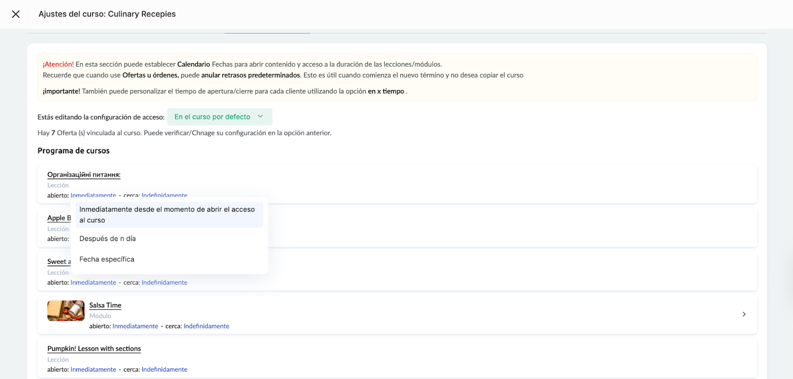 En una página separada, verás el programa del curso con la opción de establecer retrasos para lecciones y módulos.