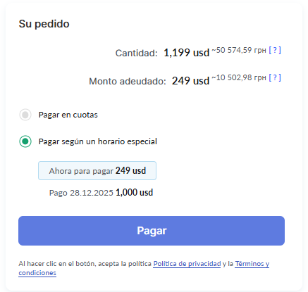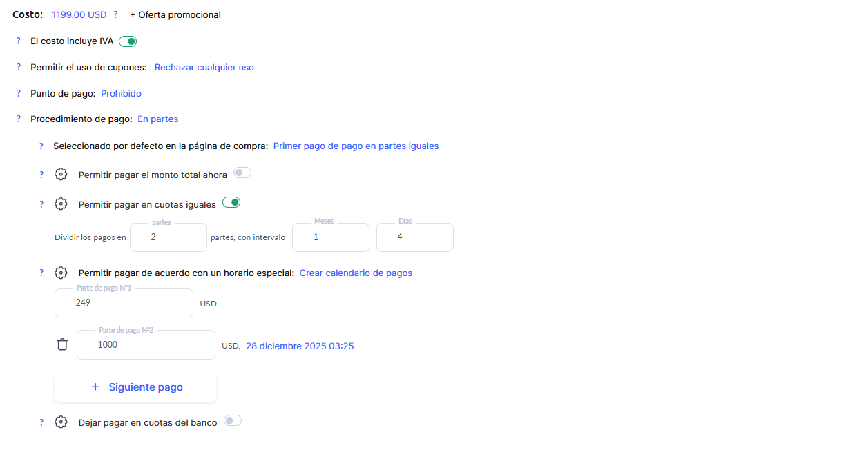Además, en el ejemplo se permite el pago completo de 1199. Puedes permitir que el importe total se pague de inmediato e indicar un importe total mayor, por ejemplo, 249 + 1000, para incentivar a quienes prefieren pagar todo de una vez.