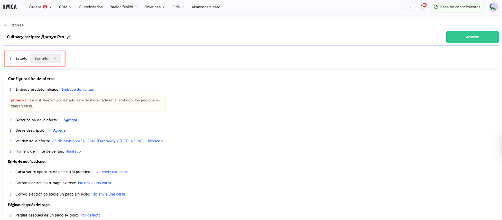 Deja el estado como Borrador, ya que este artículo describe cómo otorgar acceso sin vender a través de Kwiga. El resto de configuraciones generales, incluida la página posterior al pago, se pueden dejar sin cambios.