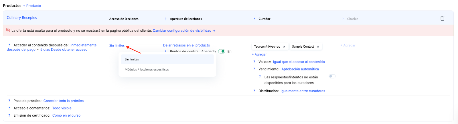 La configuración principal de una oferta es añadir un producto. Haz clic en +Producto y selecciona el curso deseado. A continuación, verás las opciones que se pueden configurar: