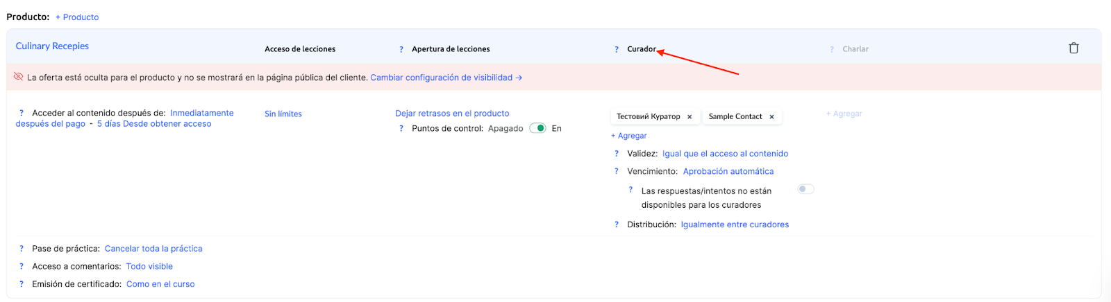 Asignación de un asistente: es útil si los estudiantes necesitan apoyo individual. Si el curador trabaja solo con participantes de un plan específico, puede asignarse a ese plan dentro de la oferta.