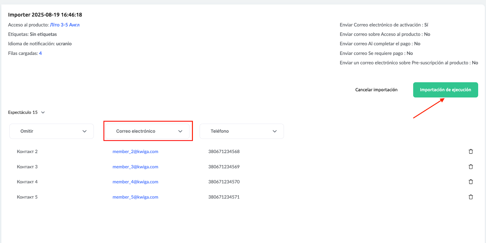 Antes de iniciar la importación, comprueba que todos los datos sean correctos y que los campos estén bien asignados, especialmente el campo de correo electrónico. Tras revisarlo, haz clic en Iniciar importación para conceder el acceso.
