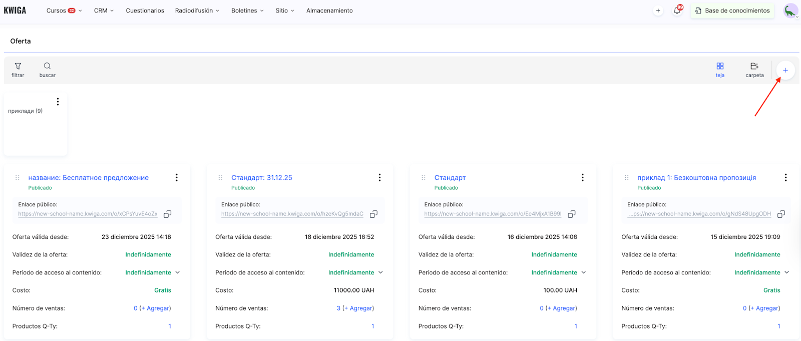 Una oferta es un plan de precios que define las condiciones de acceso al curso. Incluso si no vendiste el curso a través de Kwiga, la oferta ayuda a estructurar el acceso y a gestionar el proceso de aprendizaje. Si tienes varios planes de precios, deberás crear varias ofertas. Comienza con el plan que incluya la mayor cantidad de materiales.