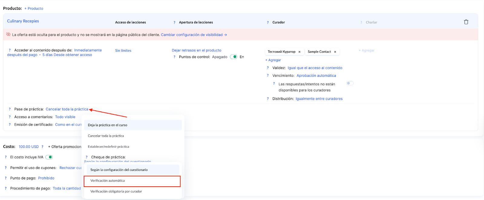 Después de configurar la oferta, puedes realizar cambios adicionales, como establecer el precio. Esto no afectará a los permisos de acceso, pero ayudará a conservar la información en el historial de compras del estudiante.