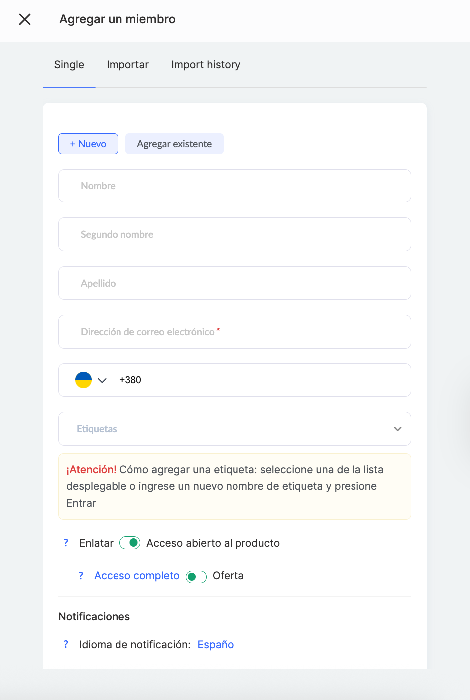 Además de importar una lista, también puedes añadir participantes de forma individual. Para ello, abre la pestaña Participantes, haz clic en + y selecciona Añadir un miembro. Luego, introduce la dirección de correo electrónico y el nombre, y elige la oferta para conceder el acceso.