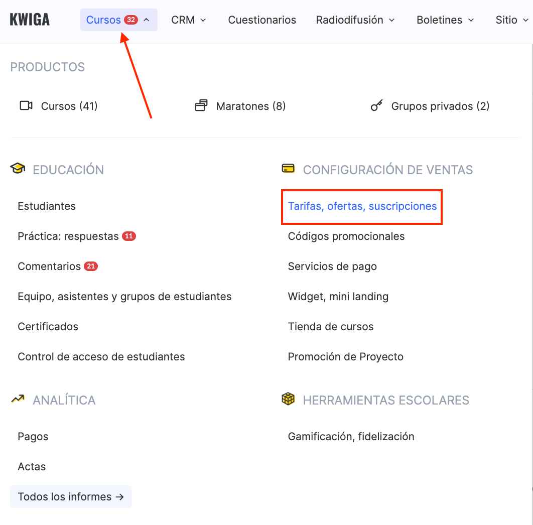 Ve a la sección Cursos → Planes de precios, ofertas.