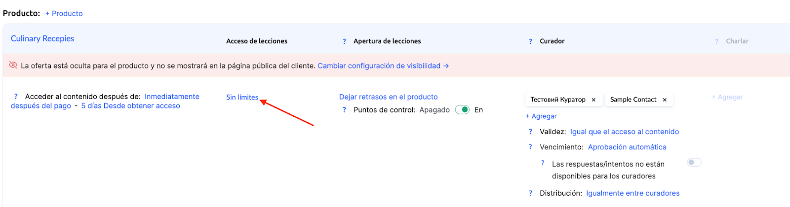 Añade el producto y configura el acceso al contenido. En la sección Acceso a las lecciones, haz clic en el texto “Sin límites”.