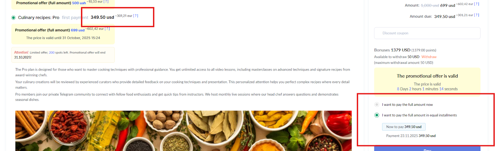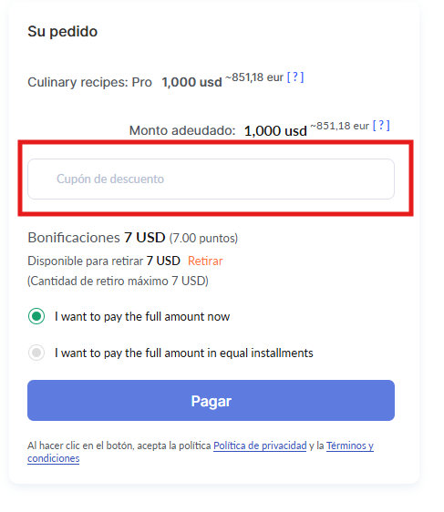 Si has creado cupones de descuento y has permitido su uso para esta oferta, aparecerá un campo especial para el código promocional en la página.