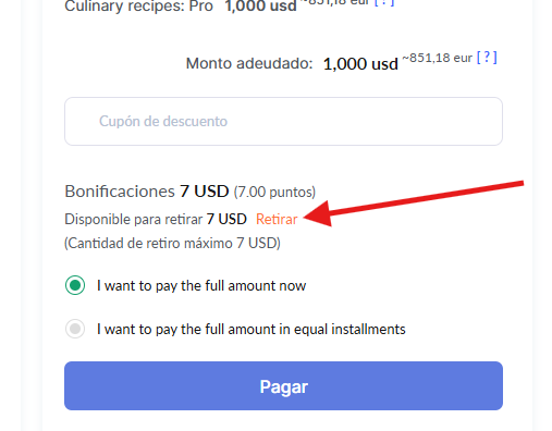 Cuando la opción de pago con puntos está habilitada, los estudiantes verán la posibilidad de utilizar sus puntos de bonificación acumulados para reducir el costo de su compra.