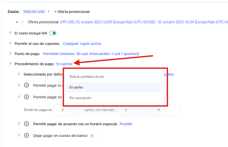 Al configurar los pagos en cuotas, puedes especificar qué importe verá el cliente como primer pago en la página de compra.