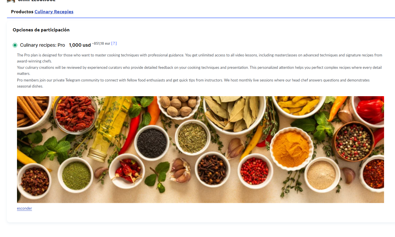 Si has creado una oferta promocional con descuento, los estudiantes verán el precio reducido resaltado en negrita, con el precio anterior tachado junto a él. Esto enfatiza visualmente el beneficio de realizar la compra en este momento.