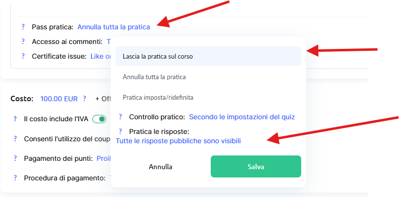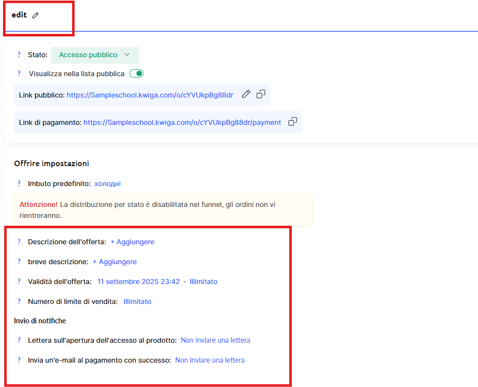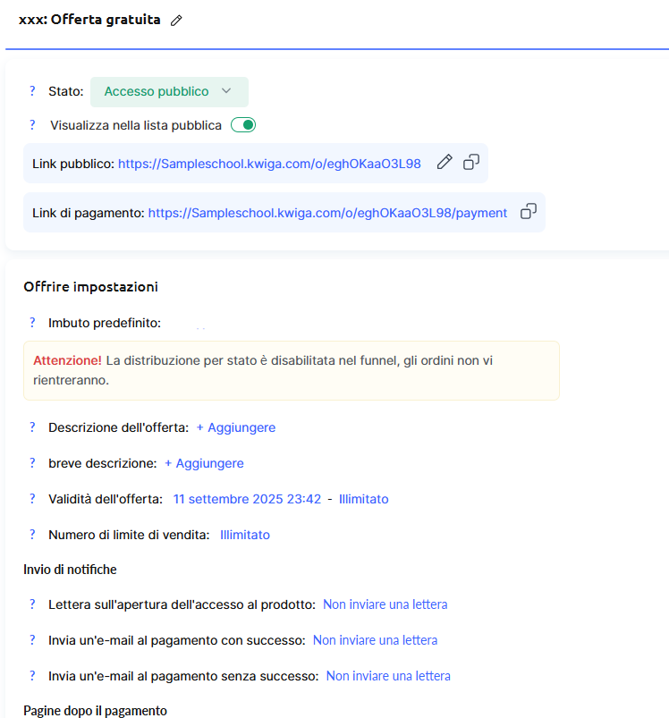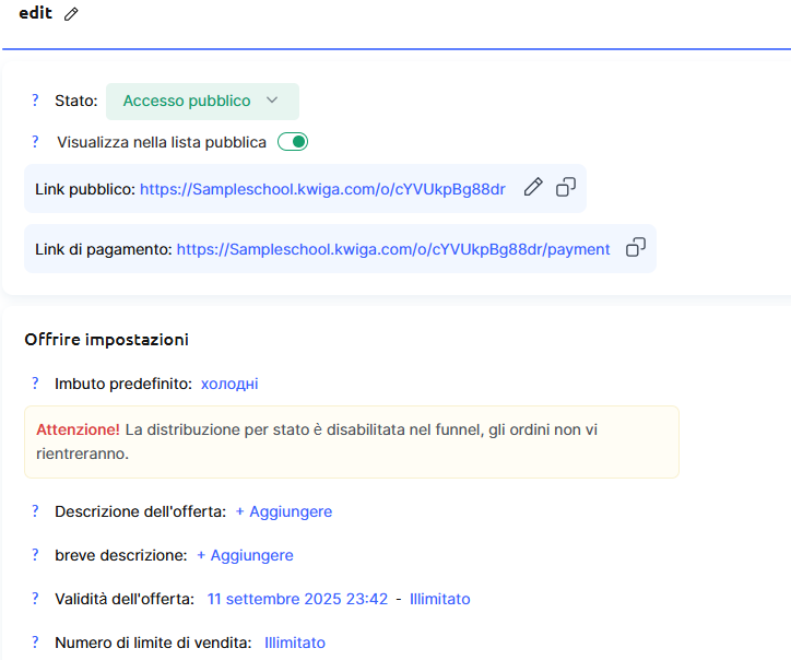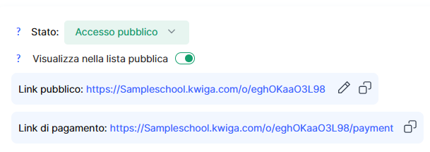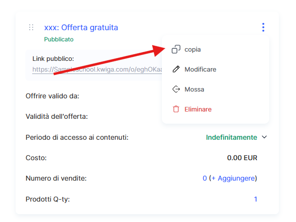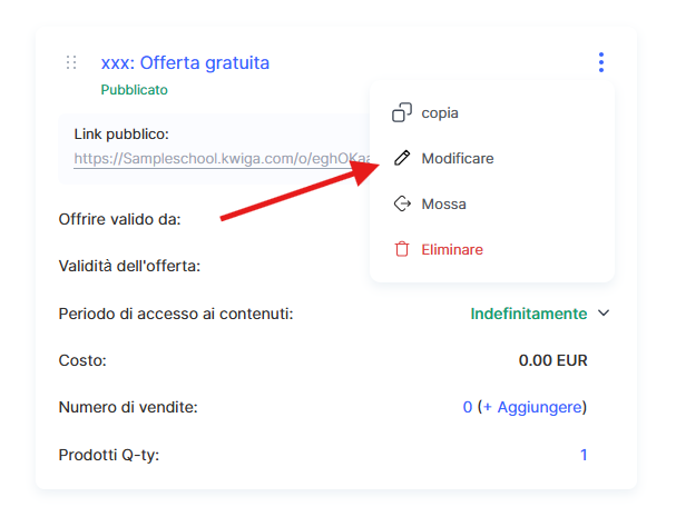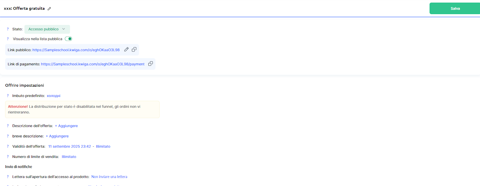 Acceso público – los estudiantes pueden acceder al enlace y comprar el curso en Kwiga. Además, puedes elegir si la oferta será: