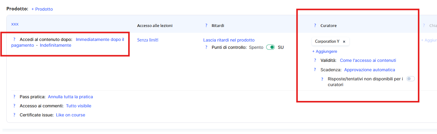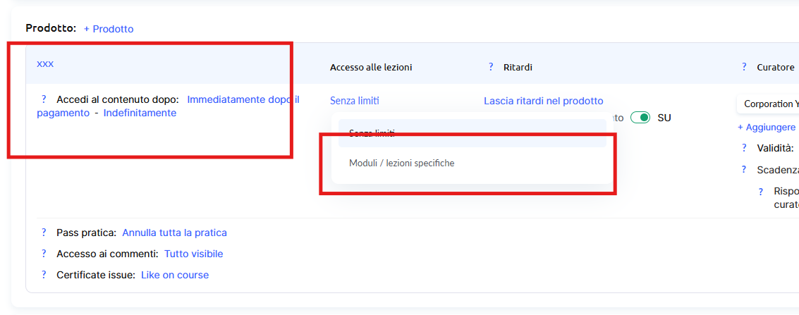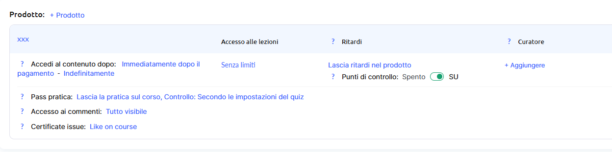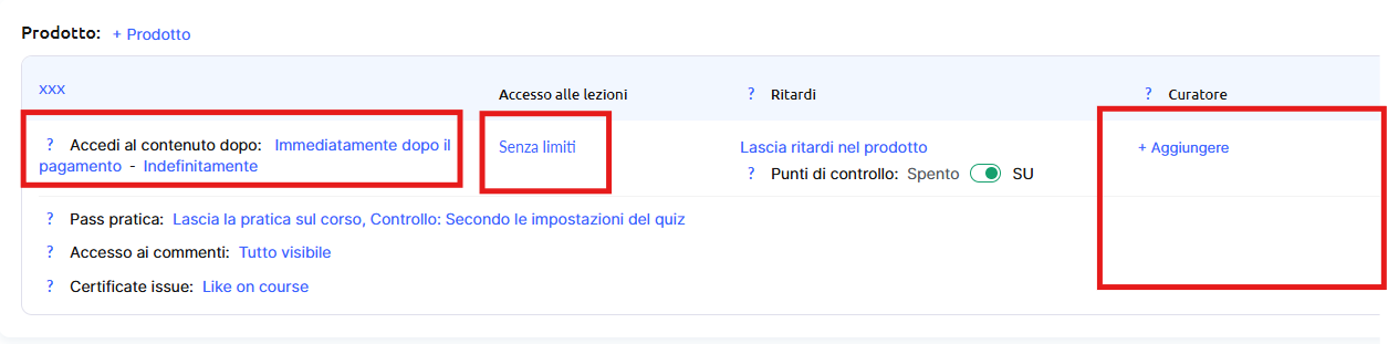 La sección principal es Producto – aquí debes definir a qué acceso del curso tendrán derecho las estudiantes.