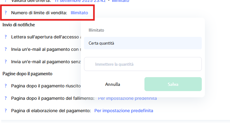 Deja sin cambios el período de venta, pero puedes eliminar o modificar el límite de ventas.