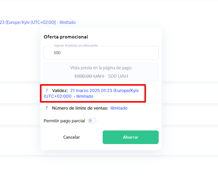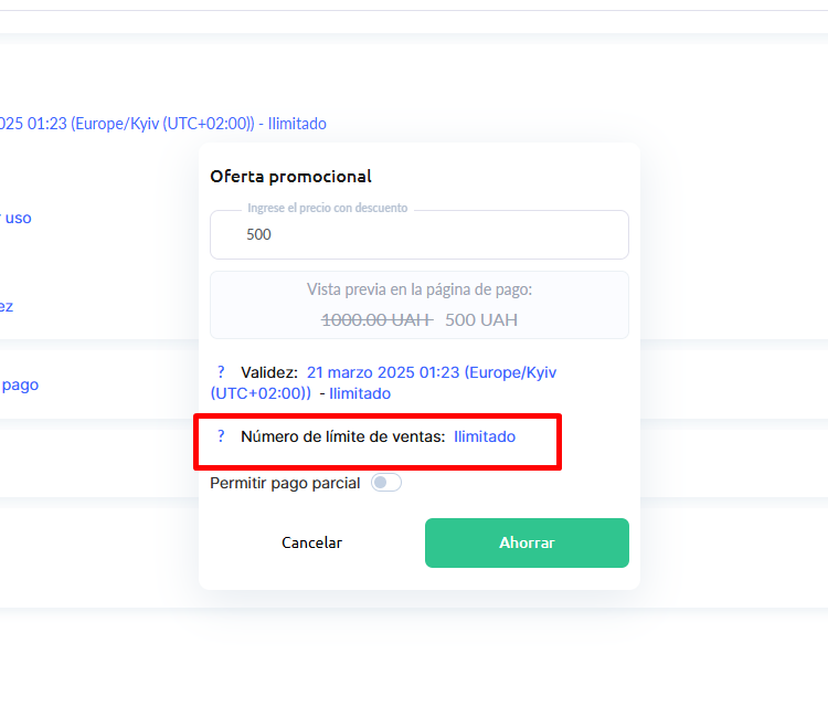 También puedes limitar el número de compras al precio promocional (por ejemplo, 10 ventas). Si no necesitas un límite, deja el campo vacío o introduce 0.