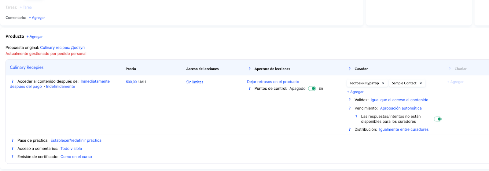 Puedes editar cualquier pedido y cambiar las condiciones de acceso. Esto es conveniente cuando deseas modificar las condiciones para un estudiante específico dentro de un grupo (por ejemplo, para conceder acceso anticipado a nuevas lecciones o cancelar controles).