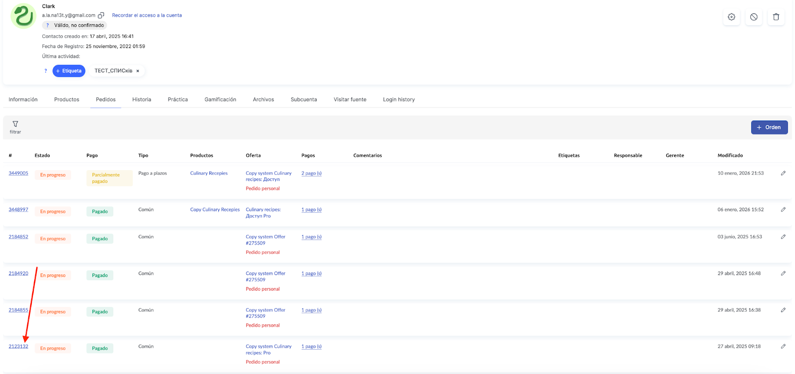 Para ello, abre el contacto, selecciona la pestaña "Pedidos", haz clic en el botón +Pedido y completa los detalles necesarios.