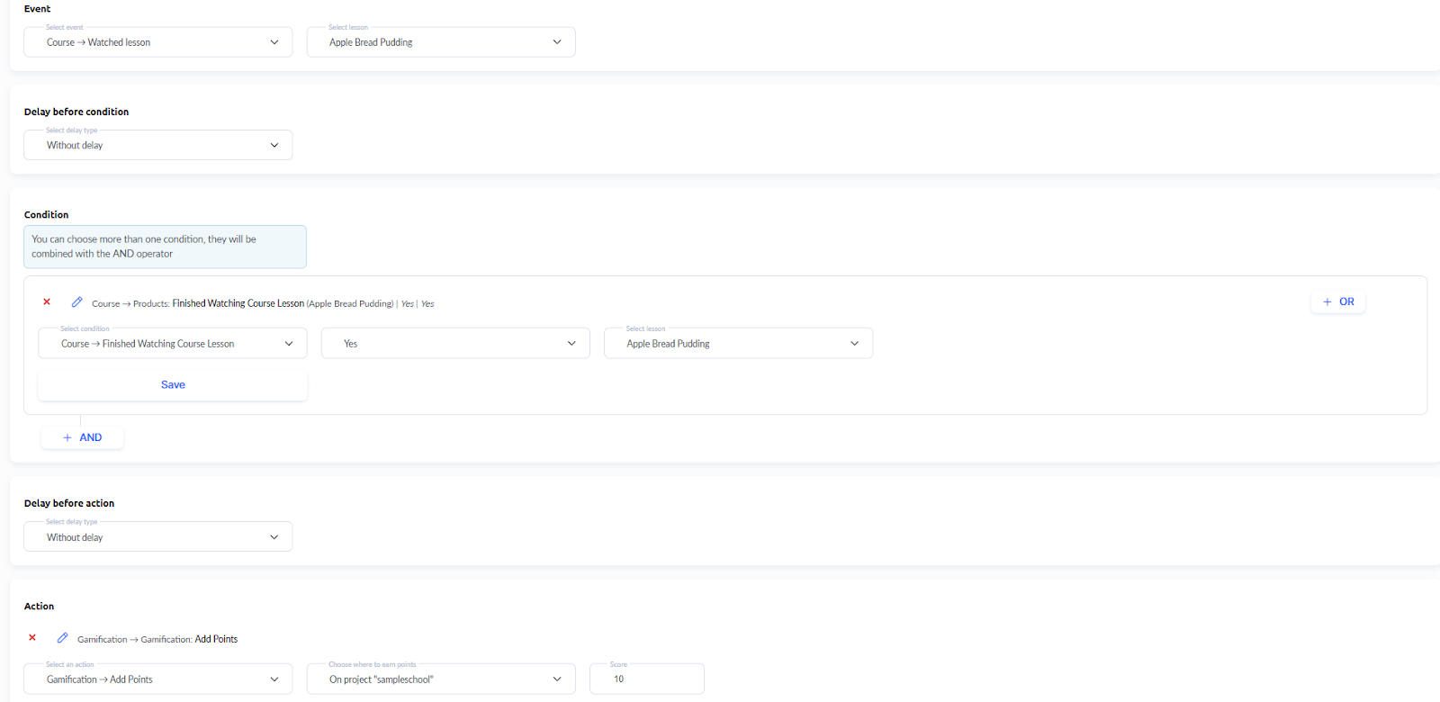 Configurez un scénario d'automatisation individuel pour chaque leçon pour laquelle vous souhaitez récompenser les étudiants. Cela garantit un suivi précis et une attribution correcte des points en fonction du type d'activité, qu'il s'agisse simplement de visionner la leçon ou de la terminer entièrement avec des quiz.