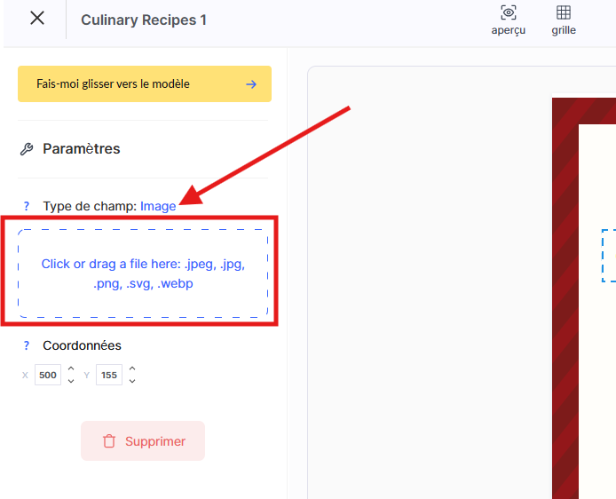 Faites glisser le bouton jaune « Glissez-moi » sur le modèle à l’endroit souhaité de la mise en page du certificat.