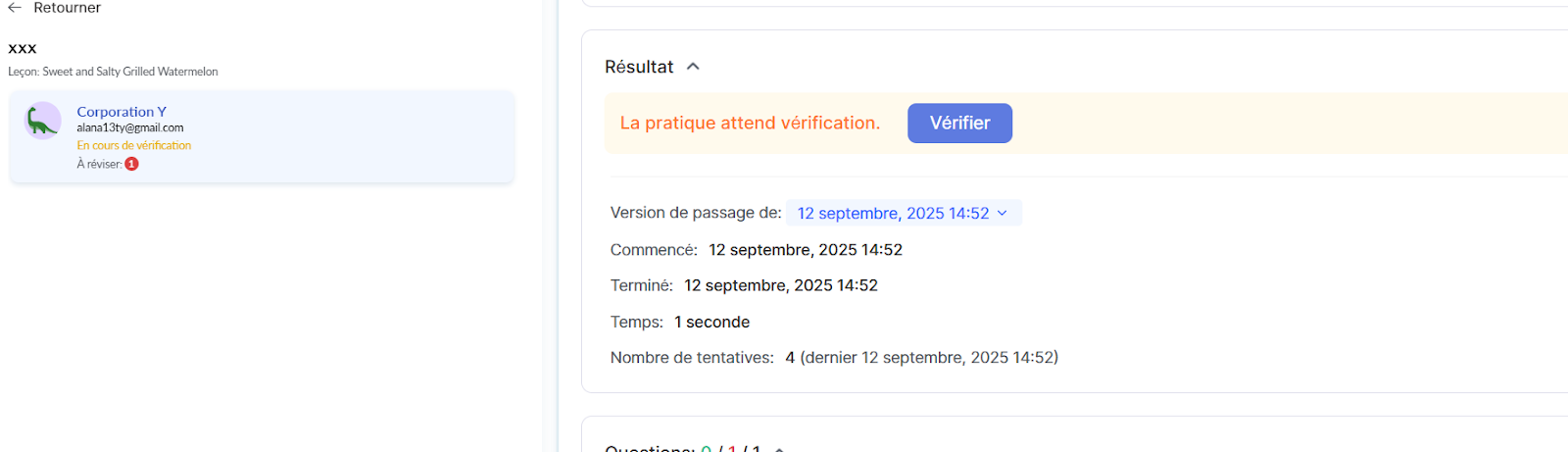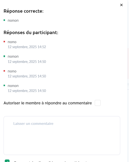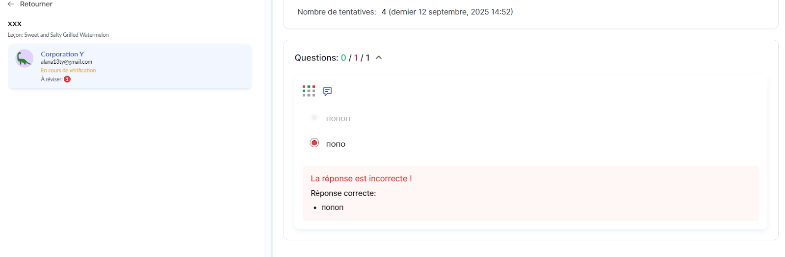 Sur la plateforme, vous pouvez configurer le nombre de tentatives autorisées pour passer les tests et les renvoyer manuellement pour révision si un étudiant n’a pas obtenu suffisamment de points ou a répondu incorrectement. Les instructions pour définir le nombre de tentatives se trouvent dans un article séparé.