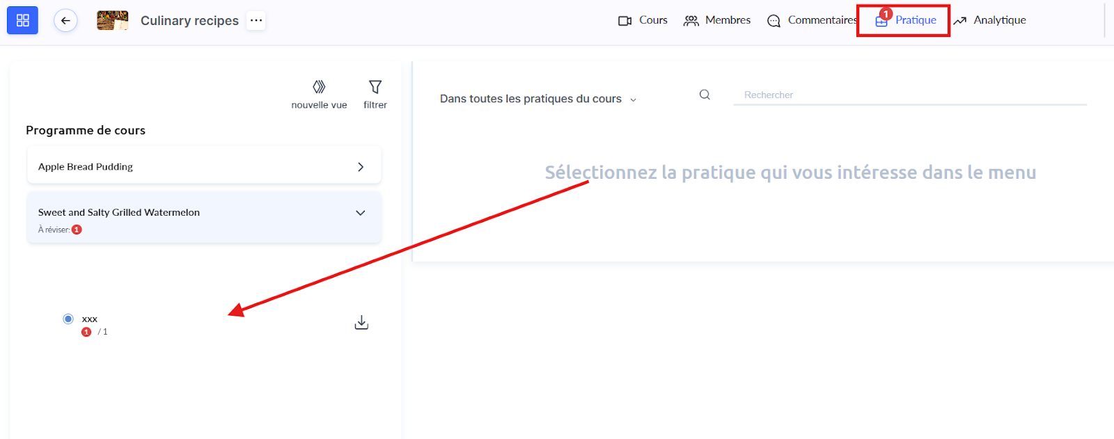 Pour afficher toutes les tentatives de test, allez dans l’onglet Pratique du cours. Cet onglet est disponible sur la page du cours — il vous suffit de cliquer sur l’icône correspondante.