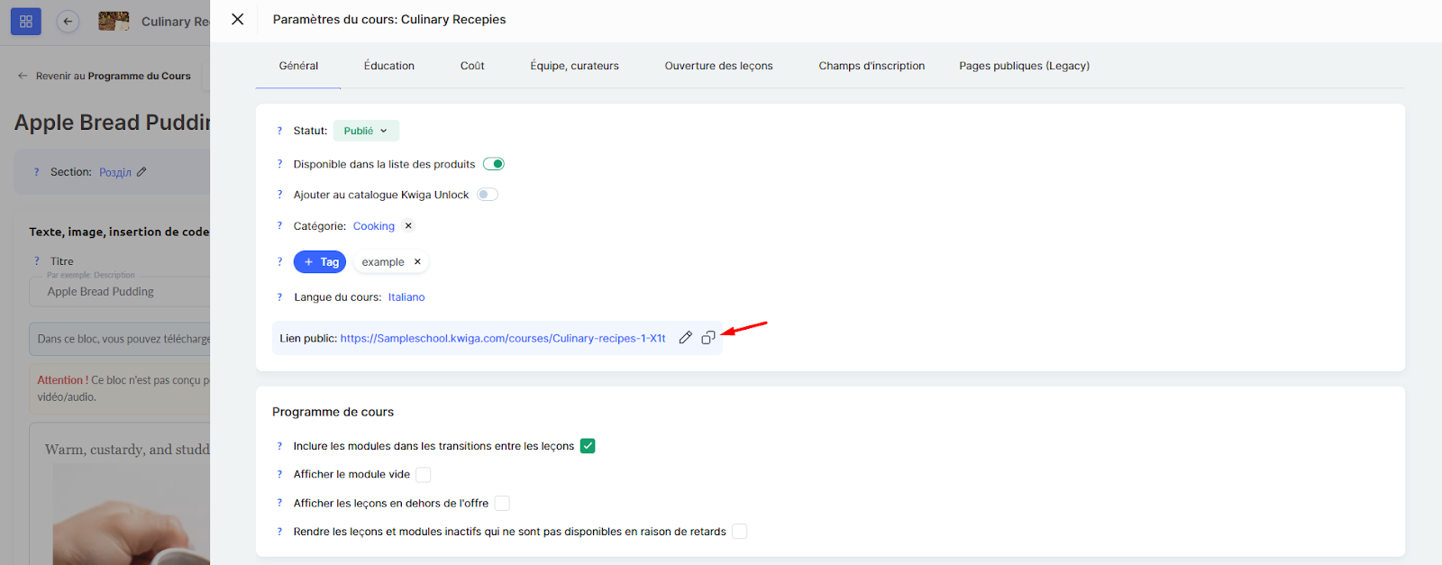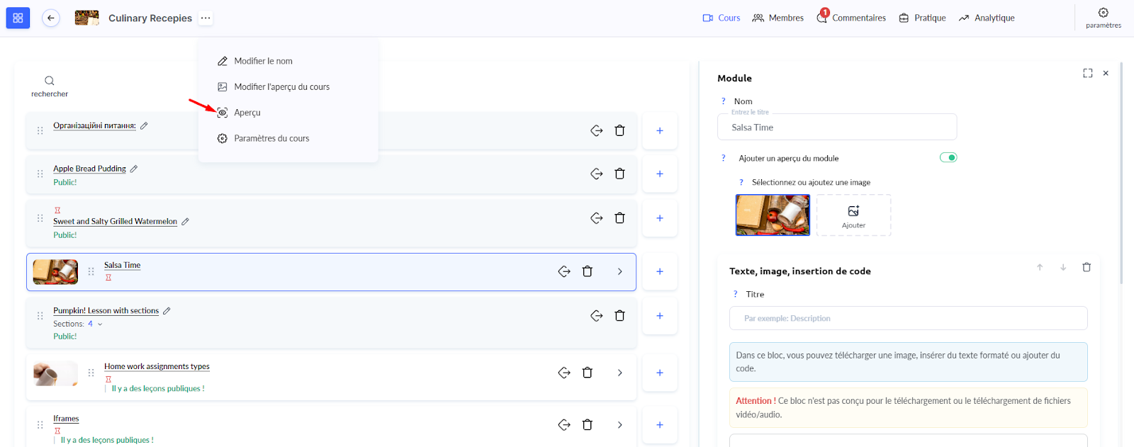 De plus, si vous ouvrez le lien public du cours ou d’une leçon tout en étant connecté à votre compte, vous verrez également votre cours (ou leçon) en mode aperçu.