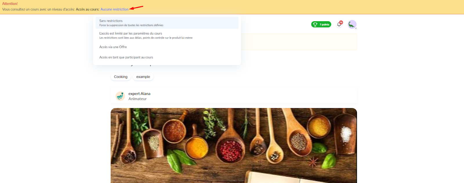 Accès illimité – Vous visualisez le cours sans aucune restriction. Cela signifie que si le cours comporte des délais de publication des leçons ou des points de contrôle configurés, ils n’affecteront pas ce que vous voyez : vous aurez accès à toutes les leçons. Ce mode est utile pour vérifier l’affichage de tous les contenus avant publication.