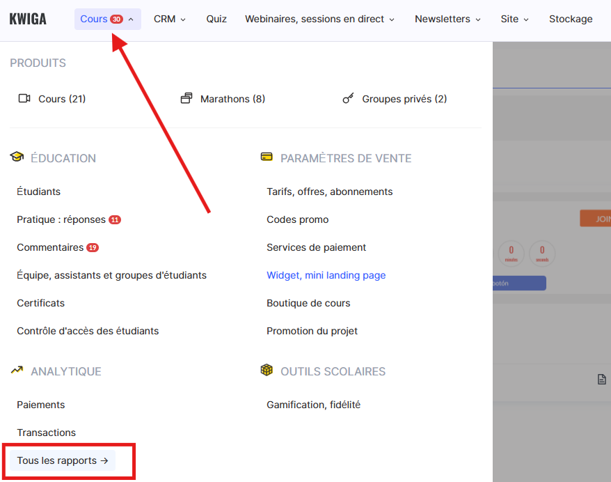 Vous pouvez accéder aux statistiques des widgets depuis le menu Cours → Tous les rapports.