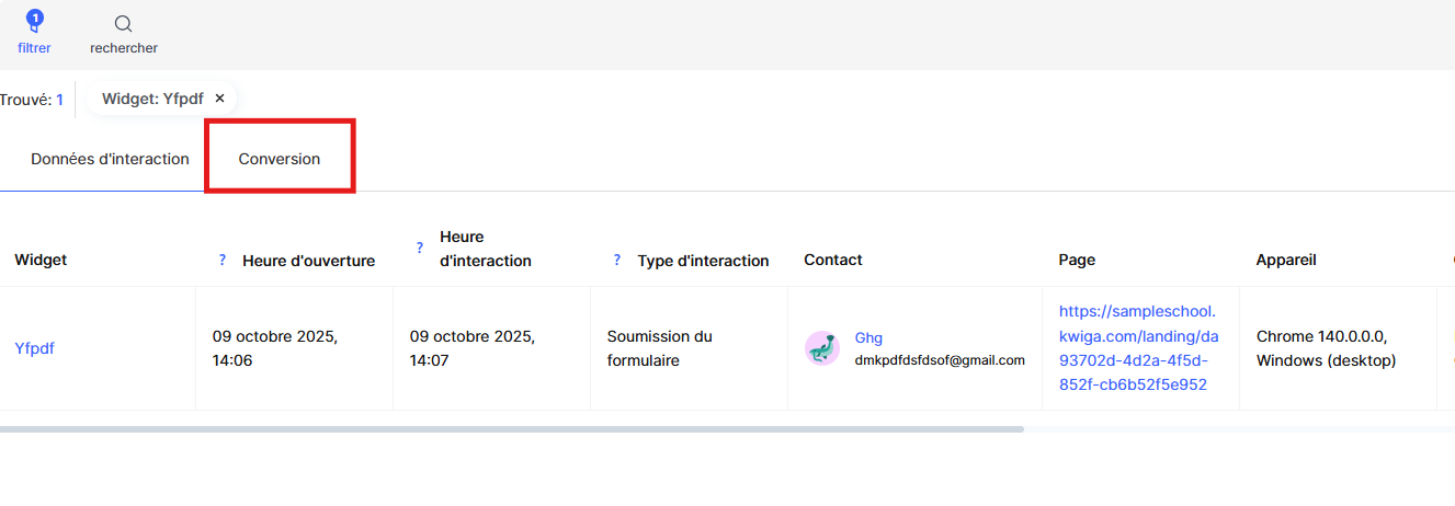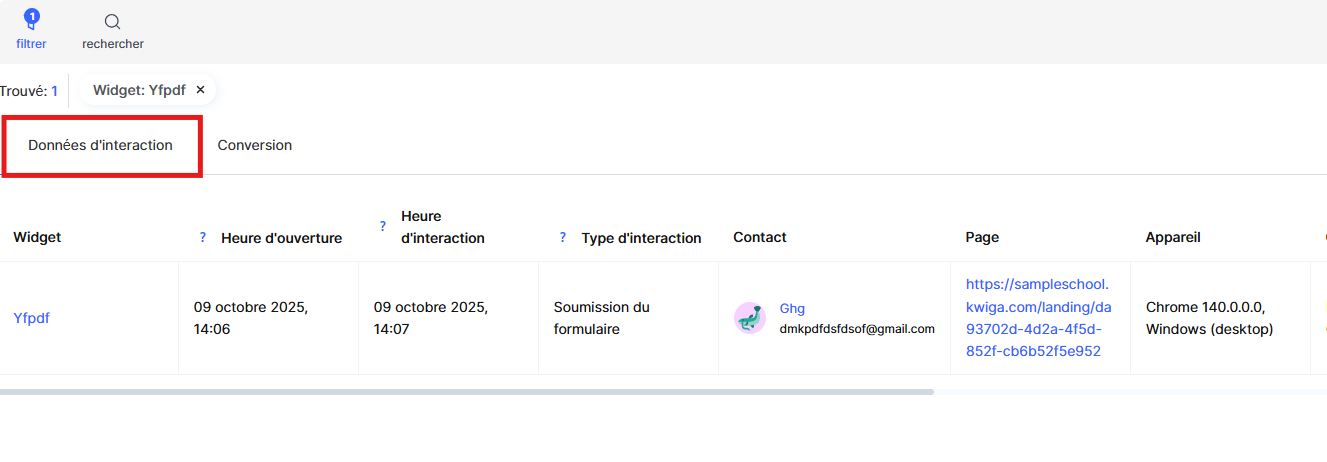 Le rapport offre une vue d’ensemble complète des performances de tes widgets : le nombre de vues et de chargements uniques, les clics et les envois de formulaires, le taux de conversion de chaque widget, ainsi que les données détaillées sur chaque contact.